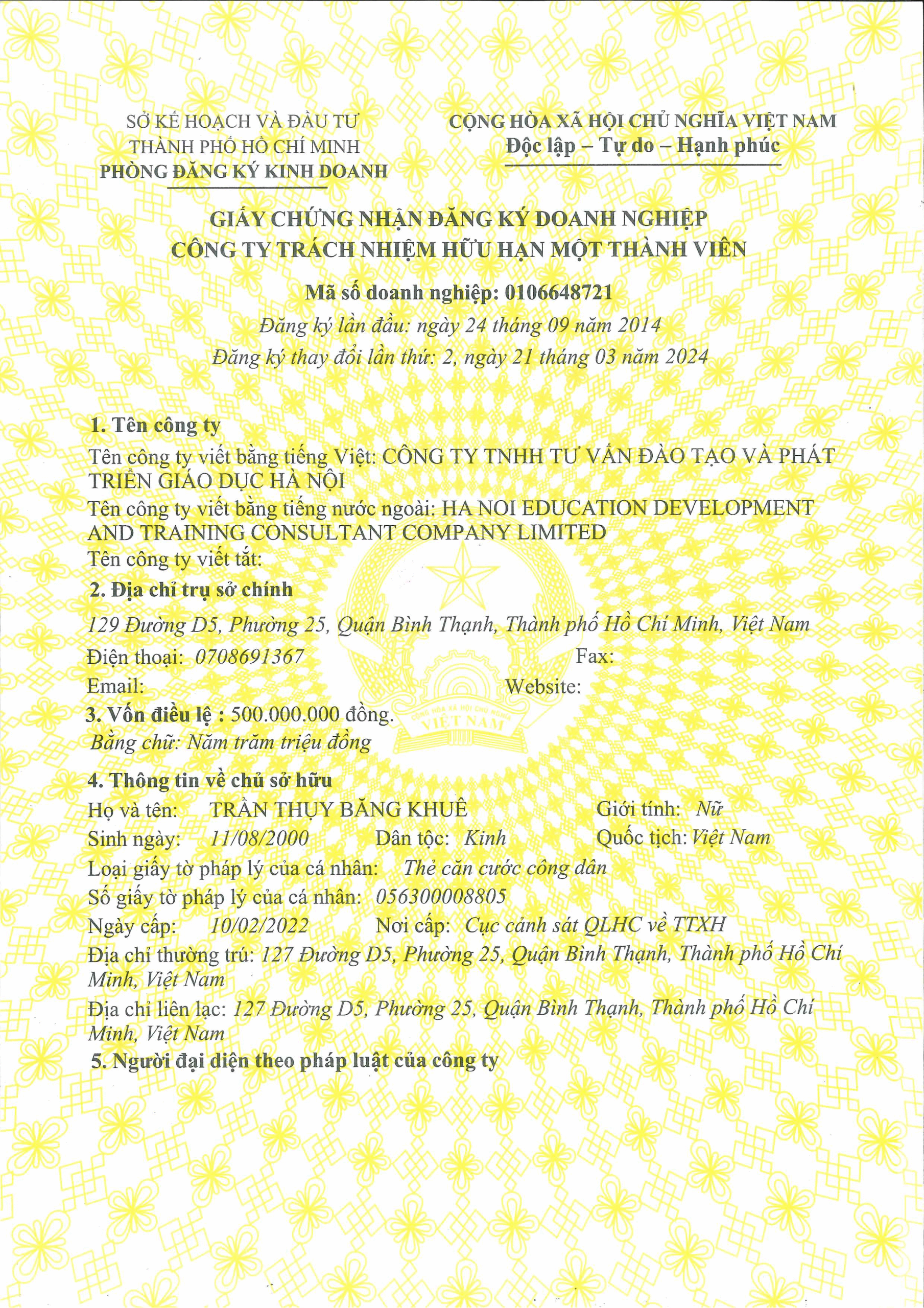 Mã số doanh nghiệp: 0106648721 do Sở Kế hoạch và Đầu tư  TP. HCM cấp ngày 21 tháng 03 năm 2024.