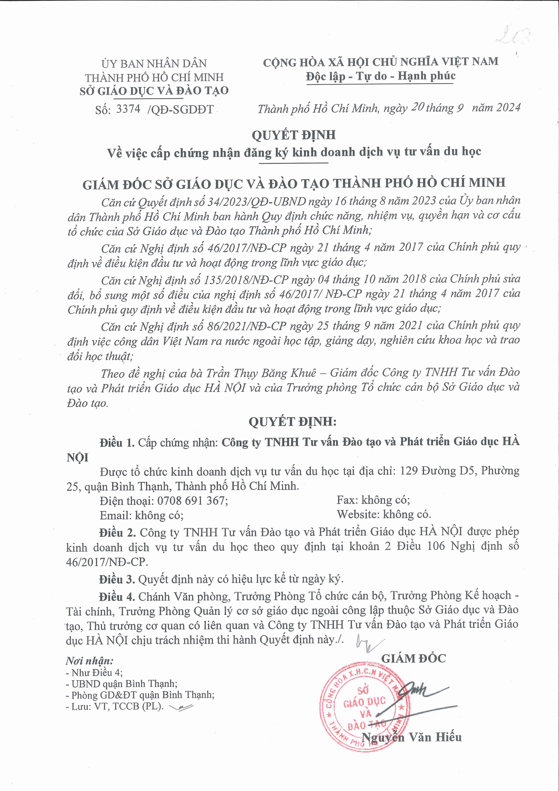 Giấp phép số: 3374/QĐ-SGDĐT về Chứng nhận đăng ký kinh doanh dịch vụ tư vấn du học, Sở Giáo dục và Đào tạo cấp ngày 20/9/2024.